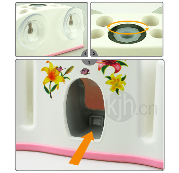 • 1.產(chǎn)品背部附強力吸盤,可固定在玻璃或光滑表面,更省空間。