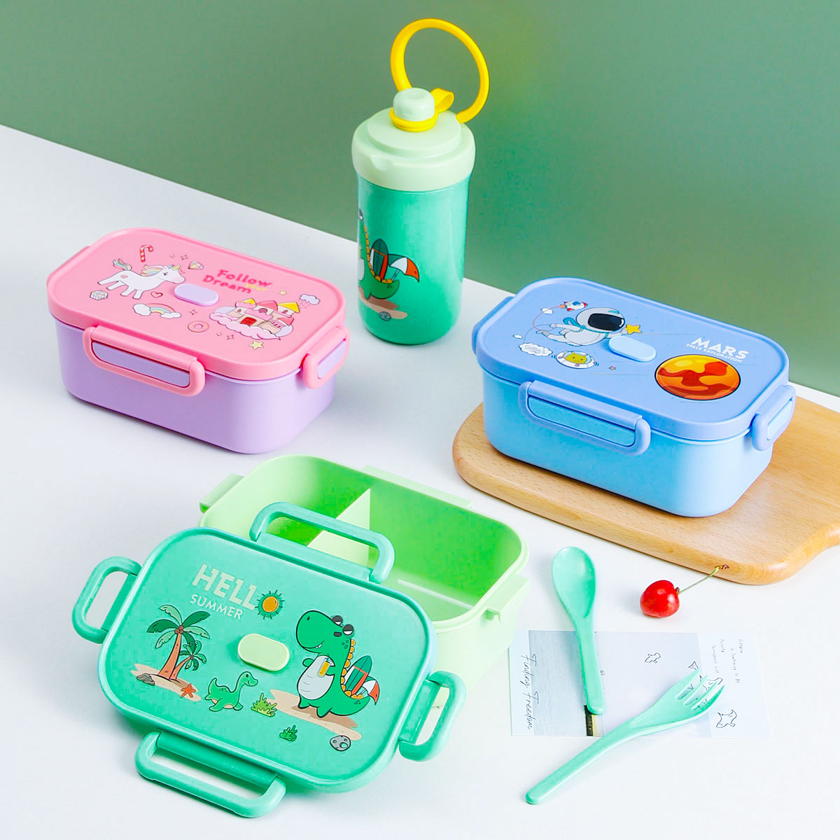 卡通長方單層/單層分格飯盒+翻蓋吸嘴/旋蓋運(yùn)動(dòng)/翻蓋運(yùn)動(dòng)水壺