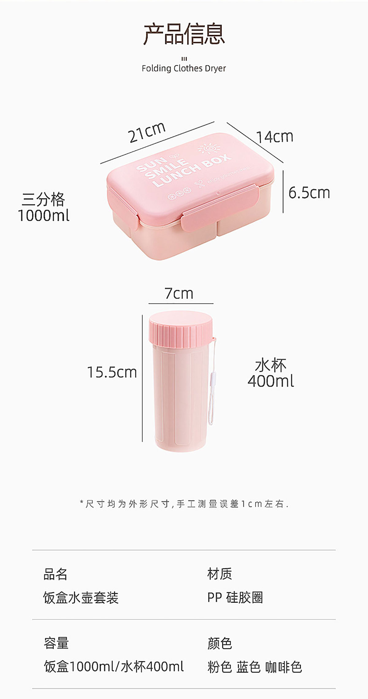 Size: 210*140*65mm/1000ml 水壺:70*155mm/400m