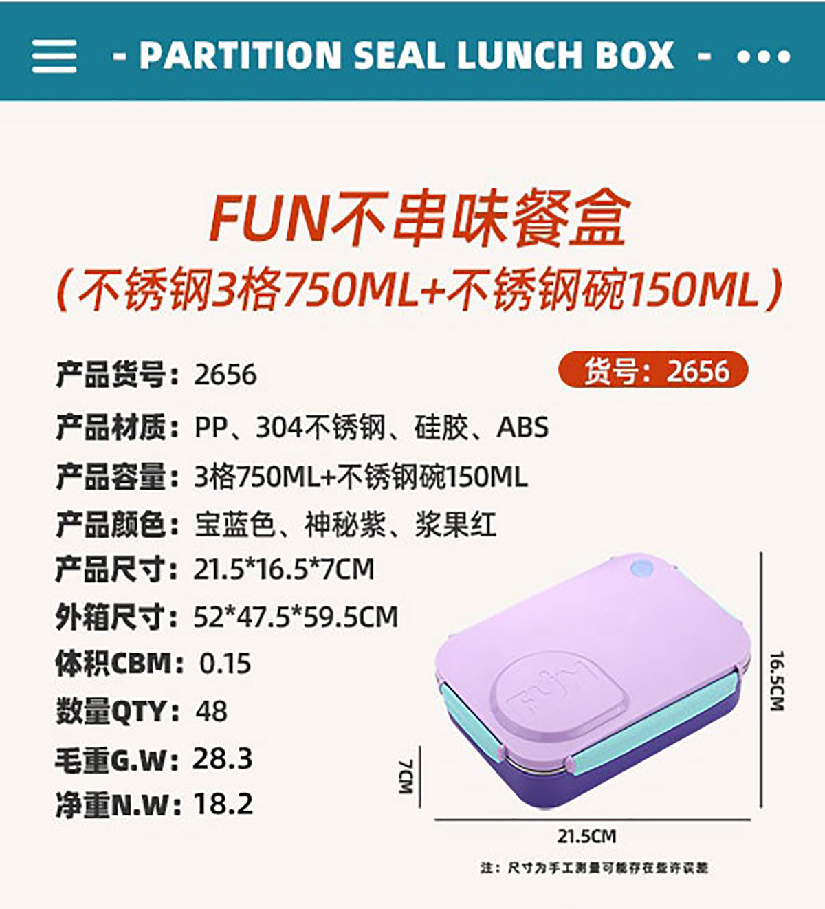 Size: AQX-2655:215*165*70mm/+塑料碗150ml AQX-2656:215*165*70mm/+不銹鋼碗150ml