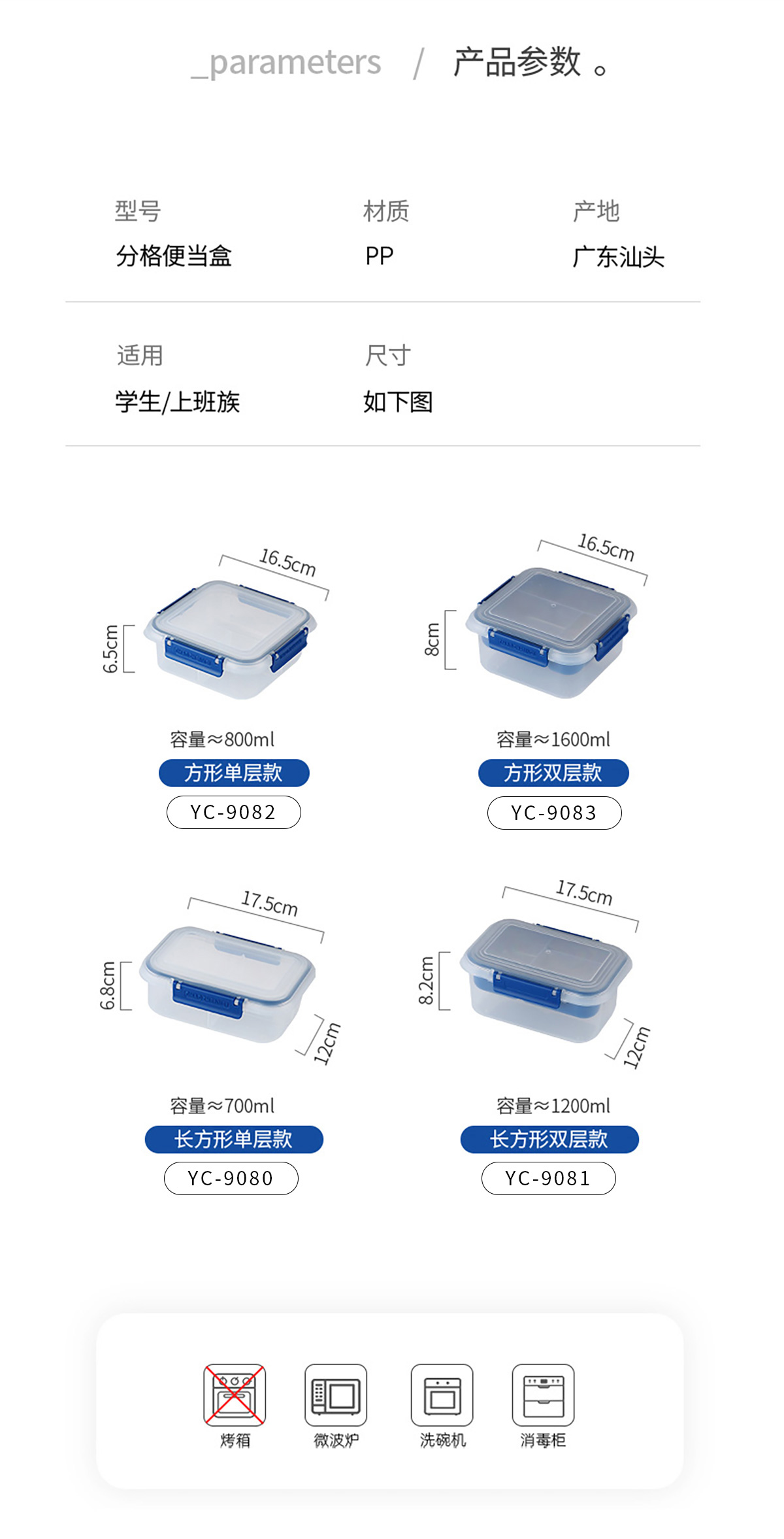 Size: YC-9080(長(zhǎng)方形單層):175*120*82mm/700ml